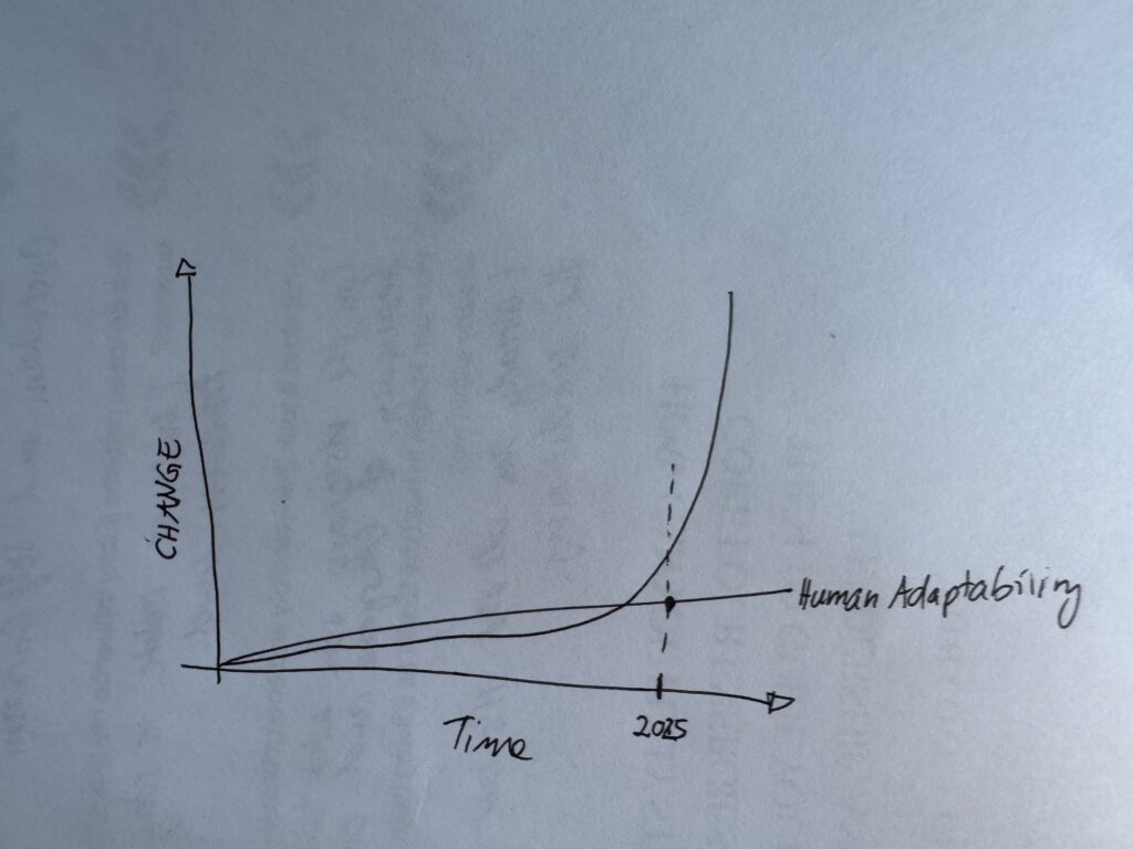 A graph showed three lines shooting skyward. Meanwhile, the curve of human adaptability stayed almost flat.
